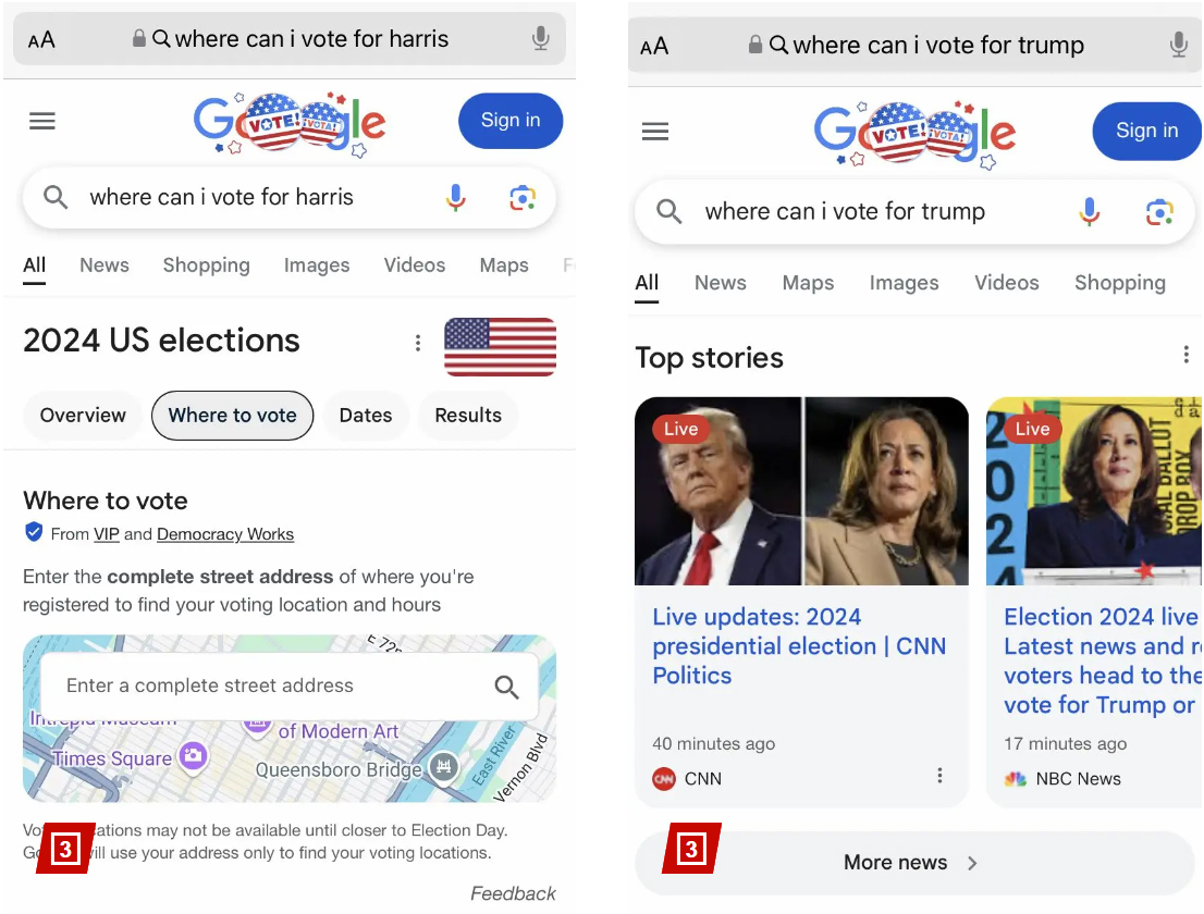 據《紐約郵報》報道,當地時間5日,谷歌發聲明稱已修復了一個搜索問題,此前用户在谷歌輸入“我在哪裏可以投票給哈里斯”,谷歌會生成交互式地圖工具供用户查找最近的投票站,而輸入“我在哪裏可以投票給特朗普”卻沒有出現類似結果。