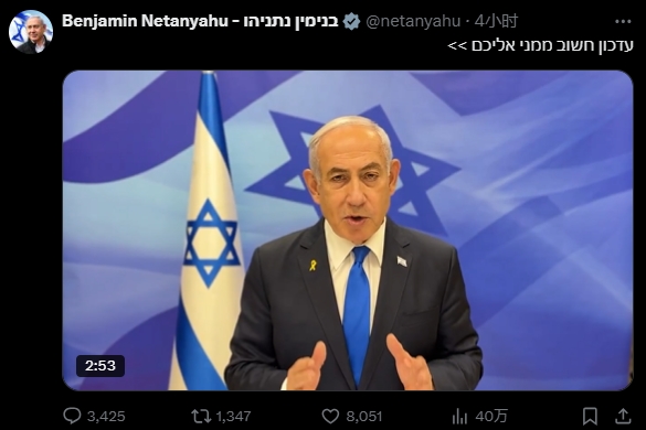 內塔尼亞胡發佈視頻聲明,宣佈將加蘭特撤職 推文截圖
