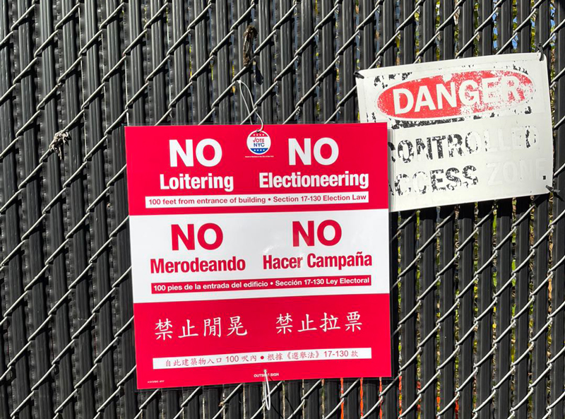 這個投票點是一所公立學校,周圍的地上和欄杆上都貼有箭頭指示投票點的方向。投票點的門口會有“在此投票”的標識,也會張貼醒目的紅色警告:禁止閒晃,禁止拉票。所有關於投票的標識上都有英語、西班牙語和中文三種語言,照顧到了在紐約市人口眾多的拉丁裔與華裔。投票點門口有一名身着便衣的保安和一名警察,沒有投票資格的筆者出於謹慎考慮,沒有進入投票點內部。