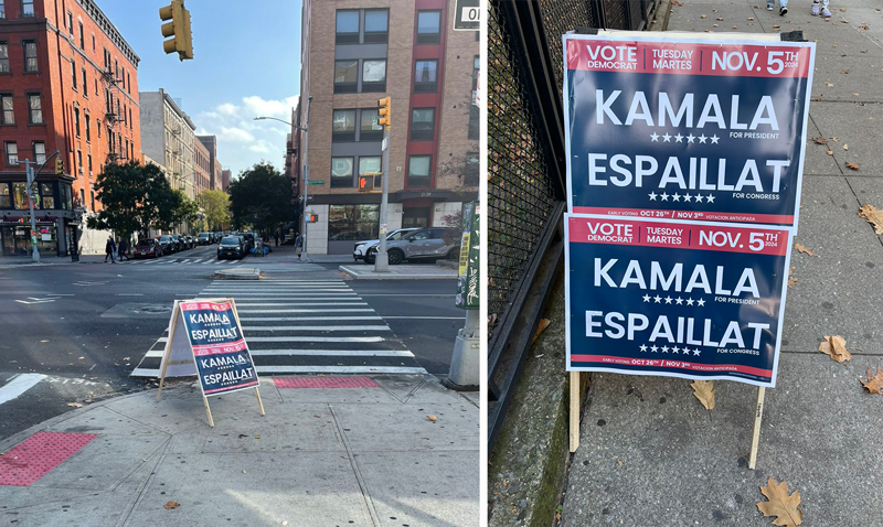 紐約州向來是民主黨的基本盤,紐約市也不例外。在過去的幾次大選中,民主黨在紐約市的得票率都高達80%左右。從投票點附近的宣傳中就能看出來民主黨在這裏佔有絕對的優勢:投票點旁的十字路口處擺放着支持卡馬拉·哈里斯的海報,甚至有一輛貼滿該海報、插着美國國旗的麪包車從投票點門口疾馳而去。特朗普和共和黨在這裏則沒有任何形式的宣傳,彷彿處於“查無此人”的狀態。筆者在門口隨機詢問了多名剛投完票出來的選民,他們無一例外都投給了哈里斯。