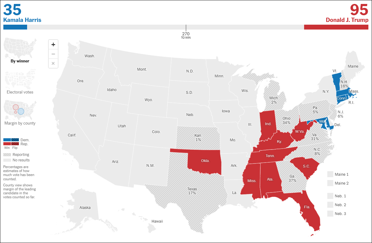 【文/觀察者網 熊超然】美國東部時間11月5日晚間,全美多地大選投票已經結束。綜合美聯社、《紐約時報》等美媒消息,截至目前,多個州的選舉人票已有歸屬,共和黨總統候選人特朗普暫時以95比35領先民主黨總統候選人哈里斯。