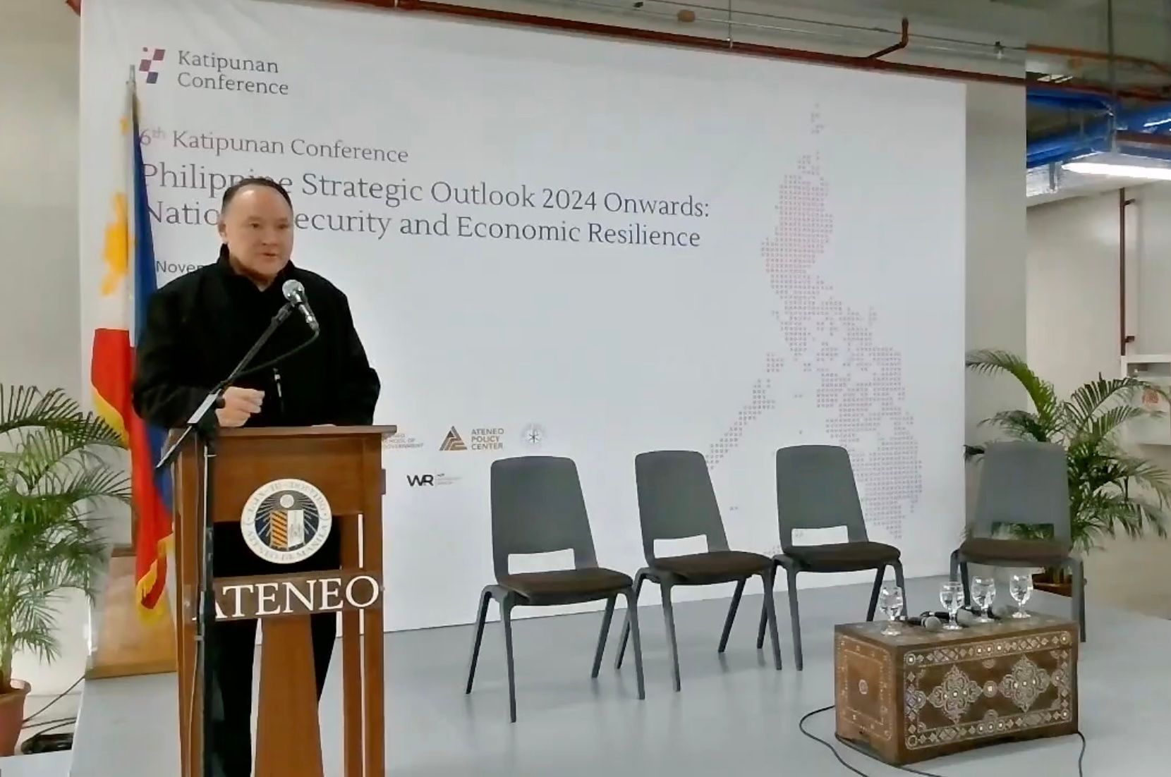 當地時間11月5日,菲律賓國防部長特奧多羅在馬尼拉雅典耀大學政府學院主辦的第六屆卡蒂普南會議上發言。學校直播截圖