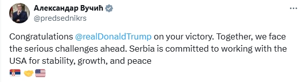 當地時間11月6日,塞爾維亞總統武契奇在其社交賬號上正式祝賀特朗普在2024年美國總統大選中獲勝。