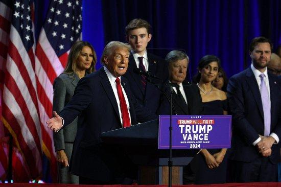 當地時間2024年11月6日凌晨,特朗普在佛羅里達州棕櫚灘會議中心發表講話,宣佈自己在選舉中獲勝。