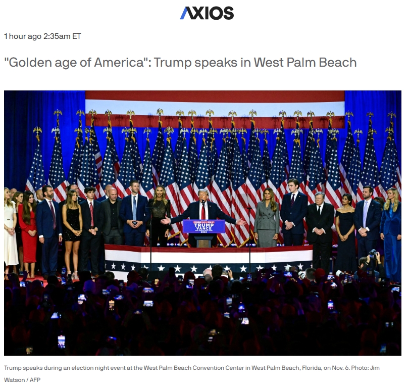 當地時間11月6日凌晨,美國共和黨總統候選人特朗普在佛羅里達州棕櫚灘會議中心發表講話,宣佈在2024年總統選舉中獲勝。截圖自AXIOS
