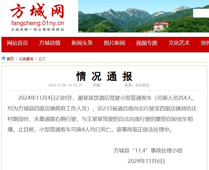 11月4日23時許,謝某某飲酒後駕駛小型普通客車(司乘人員共4人,均為方城縣四里店鎮政府工作人員),沿233省道自南向北行駛至四里店鎮油坊莊村路段時,未靠道路右側行駛,與王某某駕駛的自北向南行駛的重型自卸貨車相撞。止目前,小型普通客車司乘4人均已死亡。該事故現正依法處理中。