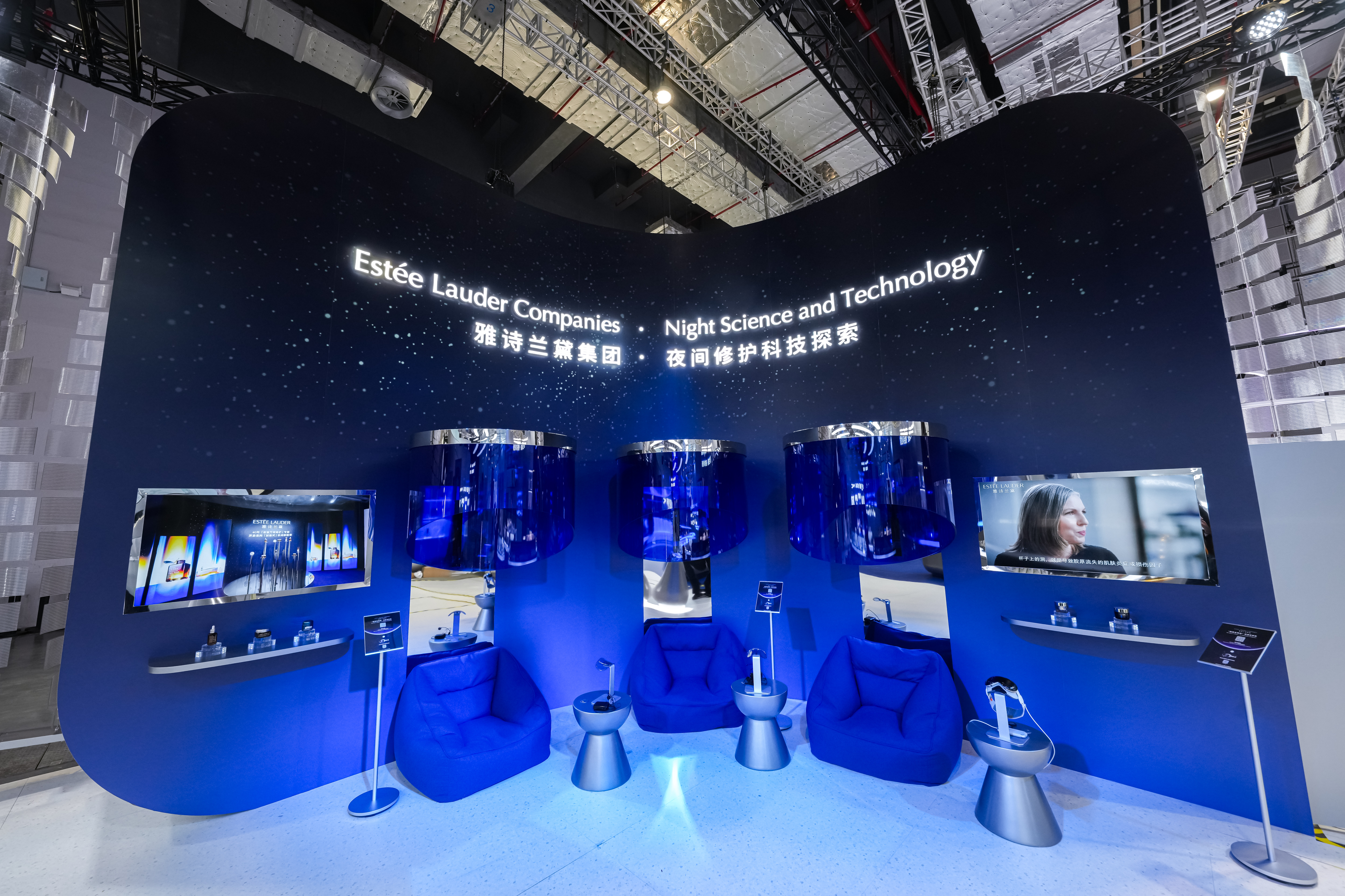 今年進博會的雅詩蘭黛集團展館內,流動線條營造視覺延伸感,為參觀者提供體驗產品、科技的精緻空間,着力呈現高端美妝和科技盛宴。