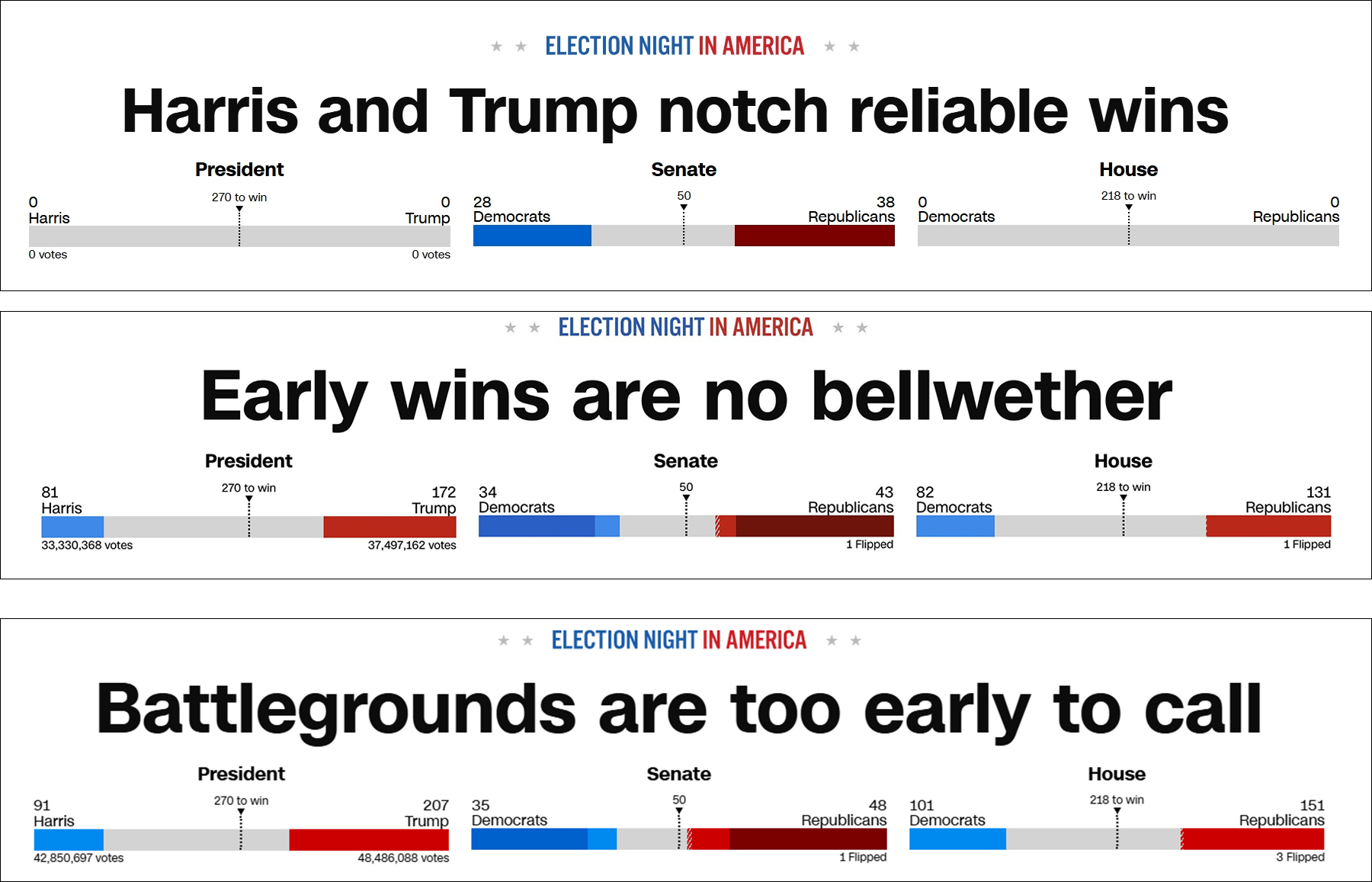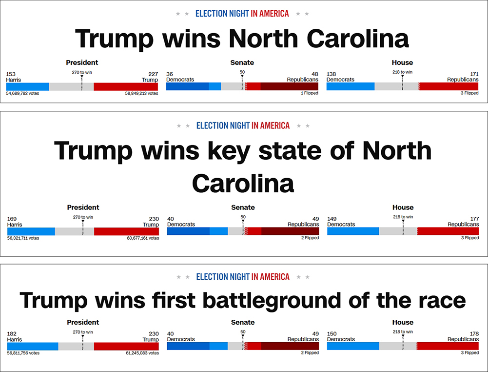 CNN當日的首頁標題也經歷了相似的變化過程。在尚未開票前,CNN的標題為“特朗普和哈里斯分別贏下安全州”;當特朗普率先取得172張選舉人票,領先哈里斯當時的81票時,CNN在標題寫道“早期領先並非風向標”;當特朗普拿到207票,將領先差距擴大至116票時,CNN又把標題改成了“對搖擺州下結論為時尚早”。