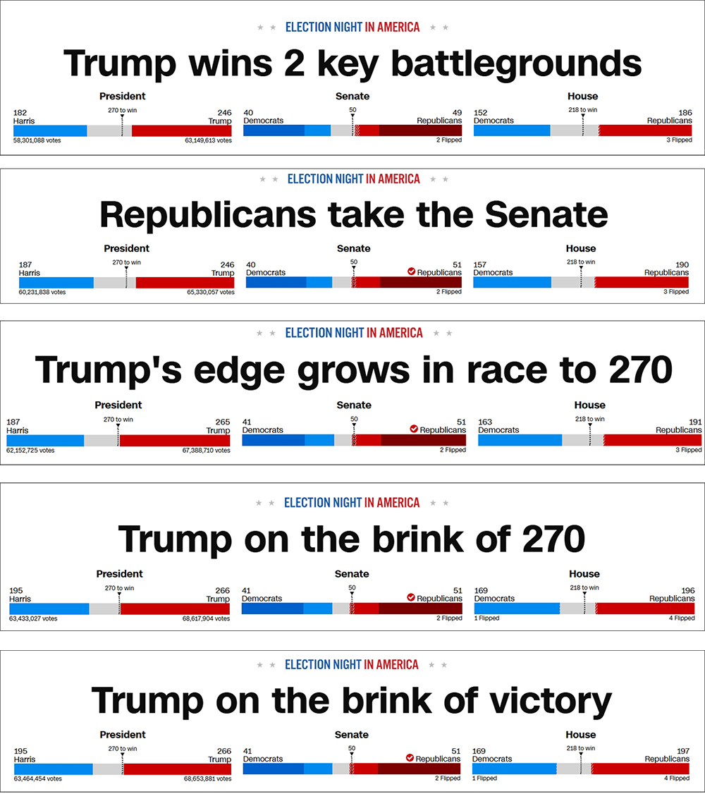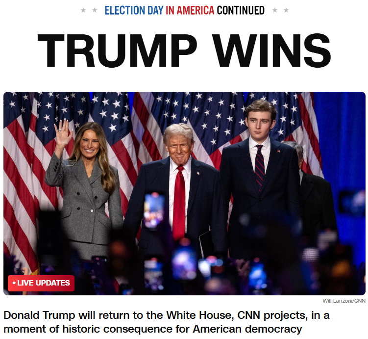 最終,在特朗普發表完勝選演講3小時後,CNN把首頁標題更換為了加大加粗的黑體字“特朗普獲勝”,並在下方寫道:“據CNN預測,特朗普將重返白宮,這對美國民主來説是一個具有歷史意義的時刻。”