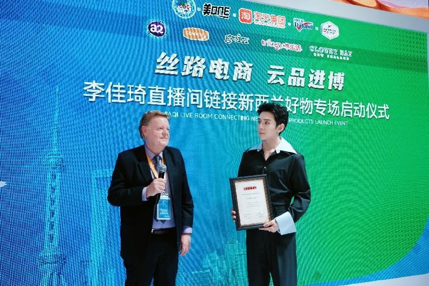 新西蘭新中貿易協會執行總裁Jeff Shepherd授予李佳琦“新西蘭推廣大使”證書
