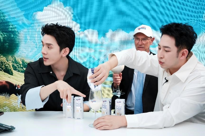 紐仕蘭乳業執行總裁羅伊與李佳琦、助播高聲講解產品
