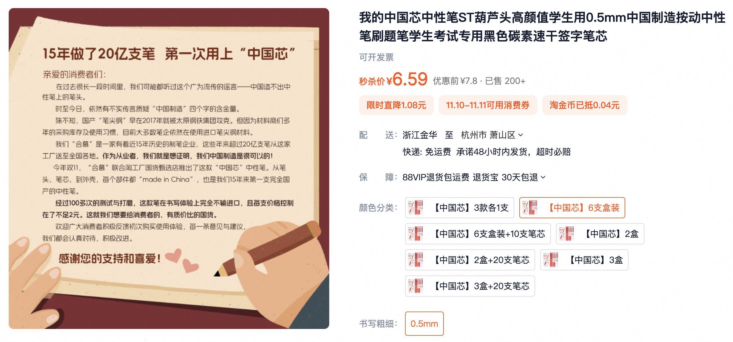 近日,媒體注意到,一款名為“中國芯”的定製中性筆在淘工廠國貨甄選店上線了。商品介紹圖上,醒目印着“筆頭筆芯外殼全部國產”、“不依賴進口”、“太原鋼鐵集團生產筆頭”等字樣。而且,6支裝一盒,每支售價不足2元。