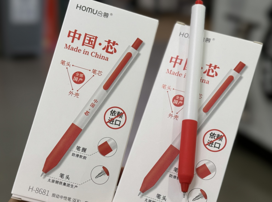 近日,媒體注意到,一款名為“中國芯”的定製中性筆在淘工廠國貨甄選店上線了。商品介紹圖上,醒目印着“筆頭筆芯外殼全部國產”、“不依賴進口”、“太原鋼鐵集團生產筆頭”等字樣。而且,6支裝一盒,每支售價不足2元。
