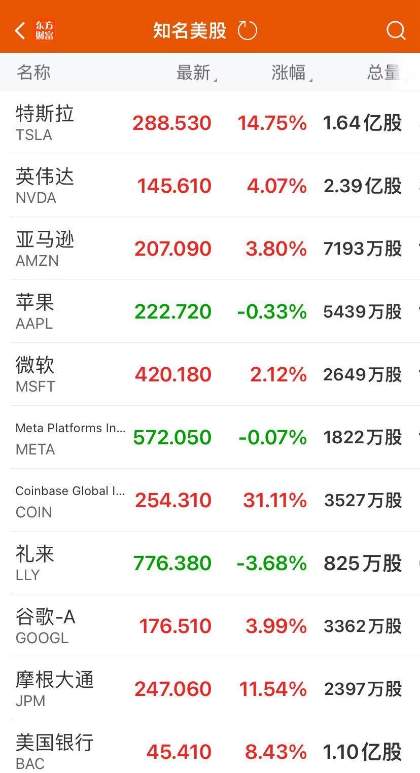熱門科技股普漲,其中,特斯拉漲超14%。