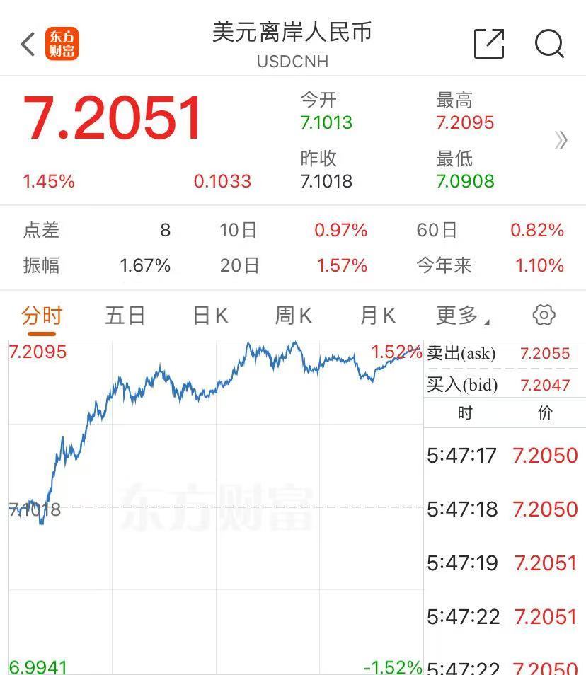 人民幣方面,離岸人民幣報7.2051,下跌超1000個基點。