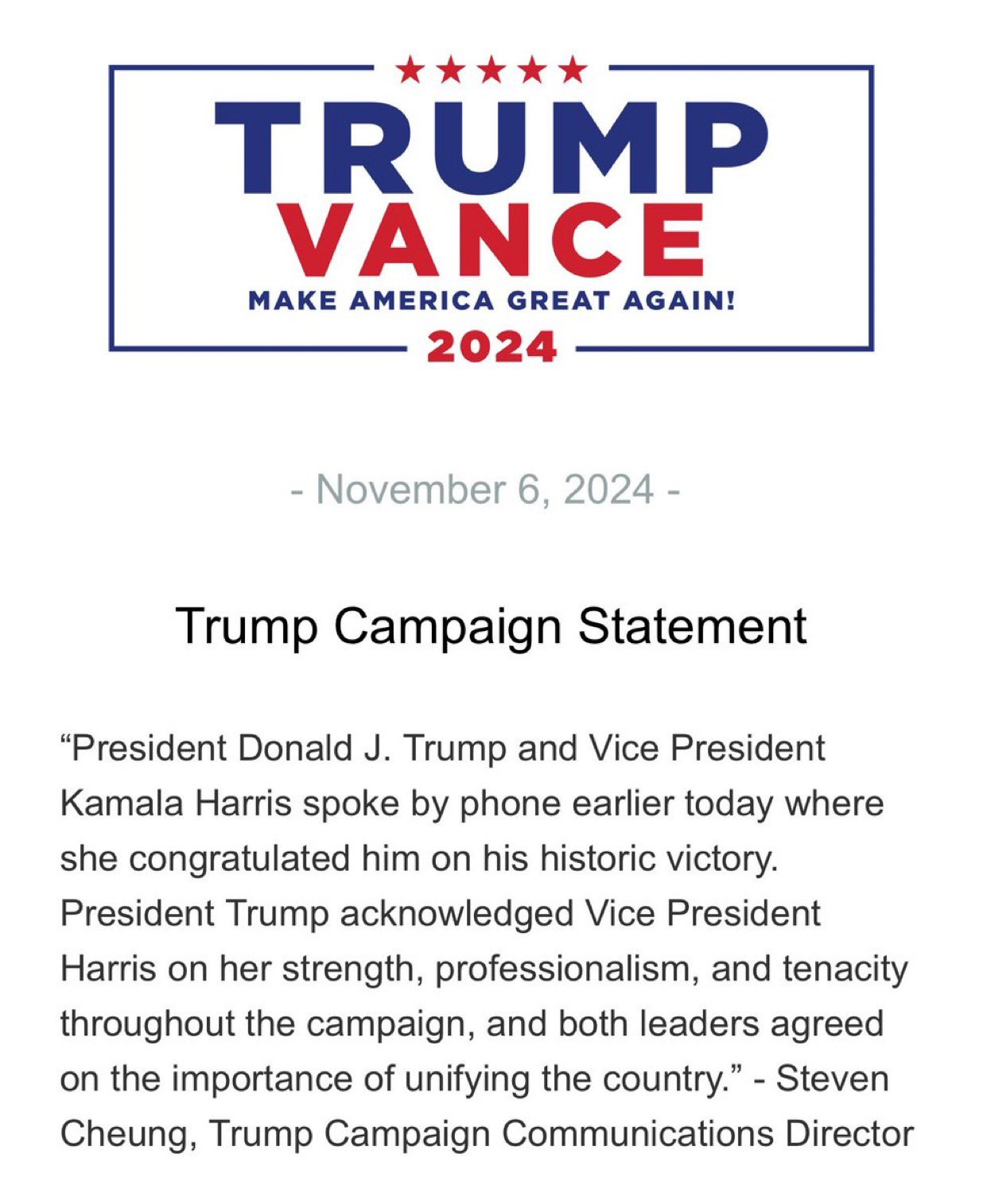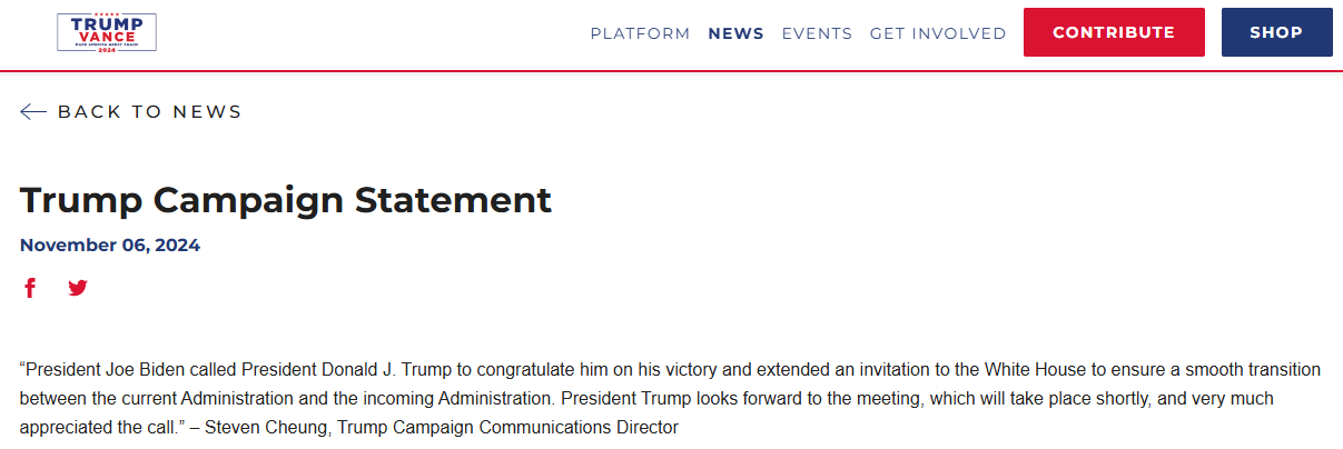 據特朗普競選團隊網站消息,當地時間6日,特朗普競選團隊發佈聲明稱,特朗普與哈里斯於當日早些時候通話,哈里斯祝賀特朗普取得歷史性勝利。