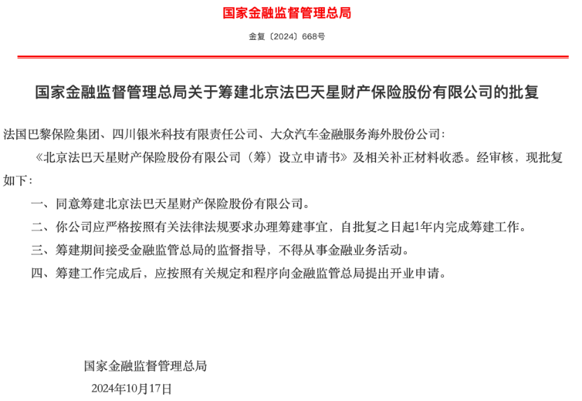 11月5日,國家金融監督管理總局發佈關於籌建北京法巴天星財產保險股份有限公司(簡稱“北京法巴天星財險”)的批覆。批覆顯示,同意法國巴黎保險集團、四川銀米科技有限責任公司、大眾汽車金融服務海外股份公司籌建北京法巴天星財險。