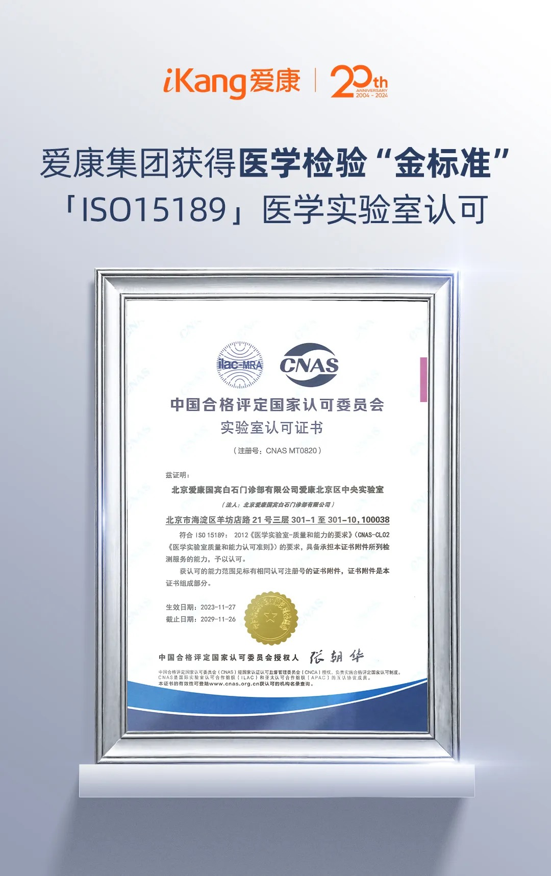 國際認可是醫學實驗室踐行質量管理的重要一環,2023年11月,愛康北京區中央實驗室獲得中國合格評定國家認可委員會(CNAS)ISO15189實驗室認可,該認可是醫學實驗室管理水平與技術能力走向規範化、標準化、國際化的重要標誌,被譽為行業“金標準”,代表着愛康北京區中央實驗室出具的檢驗報告擁有“國際通行證”,在全球100多個國家和地區均可得到互認。