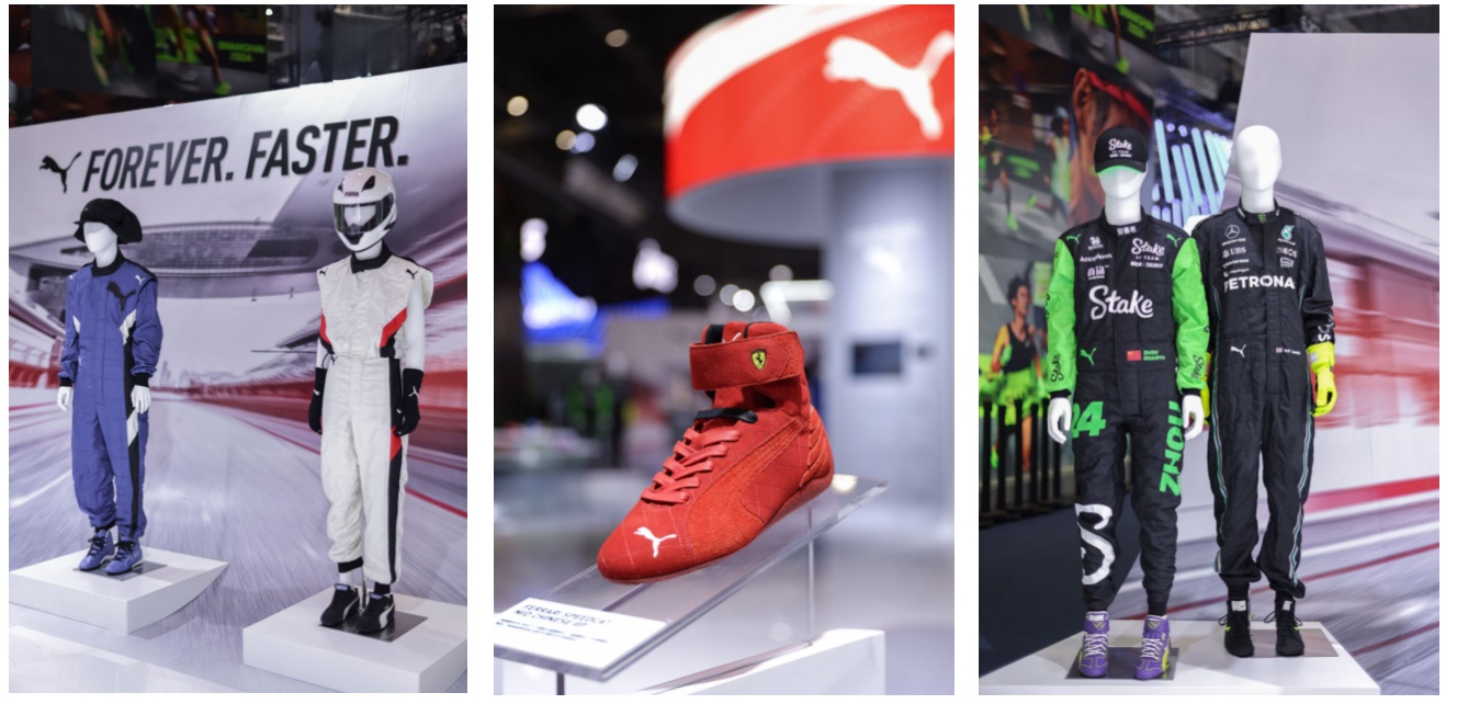 在本屆進博會現場,PUMA展台特別設置F1賽車模擬器,結合上海國際賽車場環境氛圍、F1車隊賽服,為參觀者帶來身臨其境的賽道加速體驗。此外,PUMA 展台還提前亮相了專為2025 F1中國大獎賽打造的 Speedcat Mid 鞋款,將法拉利的車隊元素與中國文化巧妙結合,包含鞋履、服飾在內的系列產品將於明年3月的F1中國大獎賽期間在中國市場發售。
