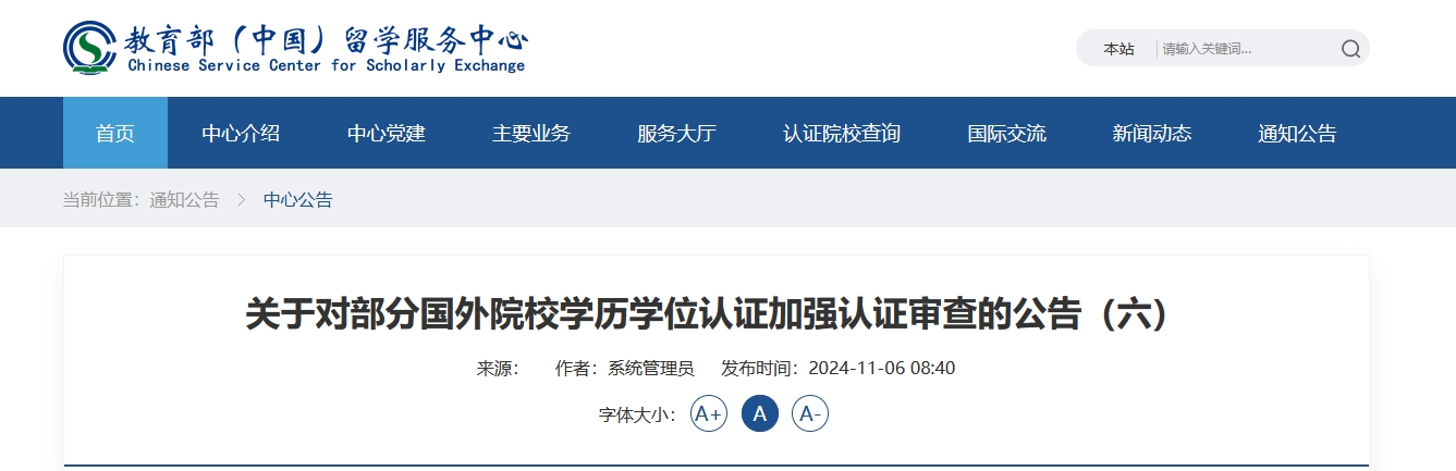 據教育部留學服務中心網站消息,教育部留學服務中心11月6日發佈《關於對部分國外院校學歷學位認證加強認證審查的公告(六)》,公告稱,近期,有13所國外院校碩士、博士學位認證數據出現顯著異常,相關舉報頻繁,根據《國(境)外學歷學位認證辦法》第二十八條,中心決定從即日起對這些院校(項目)的相關認證申請啓動加強審查程序。