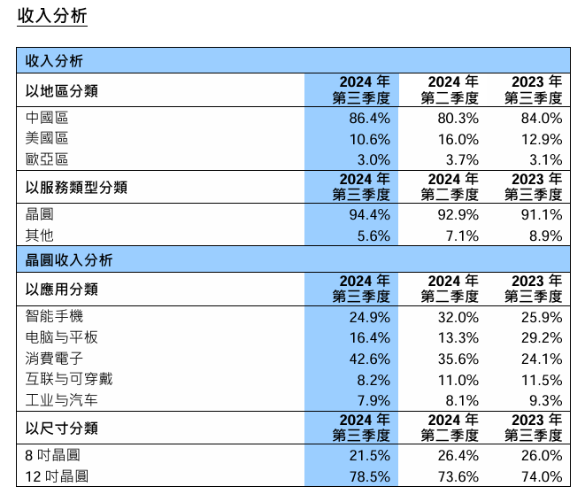 根據財報,2024年三季度,中芯國際收入按地區來看,中國區仍然是大頭,佔比高達86.4%,美國區為10.6%,歐亞區佔到3%。相較二季度,中國區佔比增長6.1個百分點,美國區下降5.4個百分點。