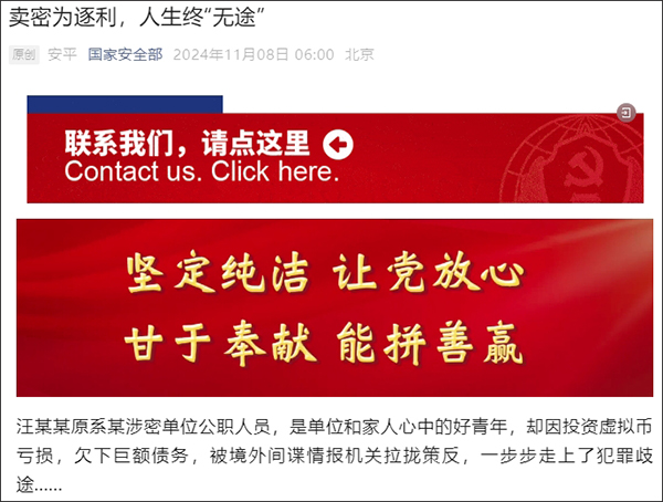 據微信公眾號“國家安全部”11月8日消息,汪某某原系某涉密單位公職人員,是單位和家人心中的好青年,卻因投資虛擬幣虧損,欠下鉅額債務,被境外間諜情報機關拉攏策反,一步步走上了犯罪歧途……