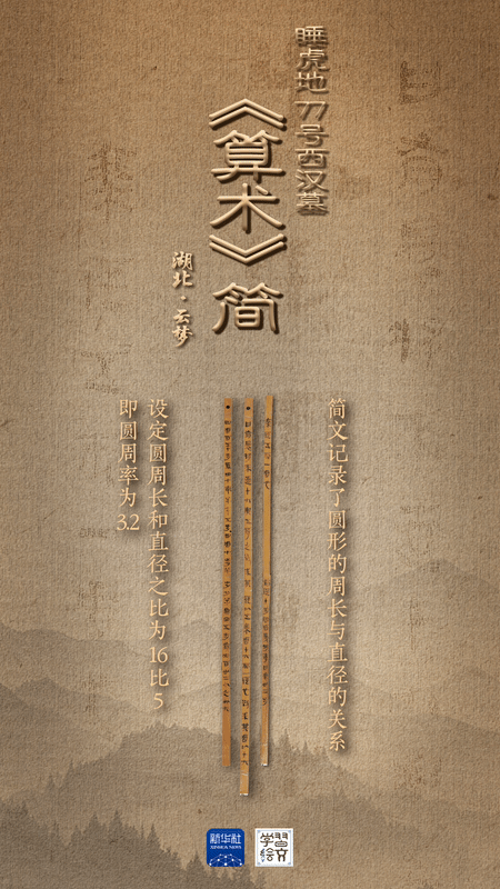 簡牘裏的《算術》,是古人科學智慧的精彩呈現。三枚關於計算圓形田地面積方法的西漢簡牘保存完好,為首次公開展出。“有睘將來直十六與五侍之”,睡虎地漢簡中列舉的這道算術題顯示,周長和直徑之比為16:5,即圓周率為3.2,證明秦漢之際已有人認識到比3更精確的圓周率,為出土簡牘所僅見,尤其珍貴。