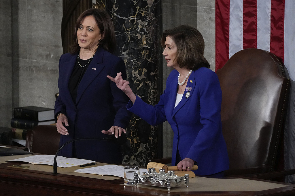 2022年12月21日,美國華盛頓特區,美國副總統卡瑪拉·哈里斯和眾議院議長南希·佩洛西。視覺中國