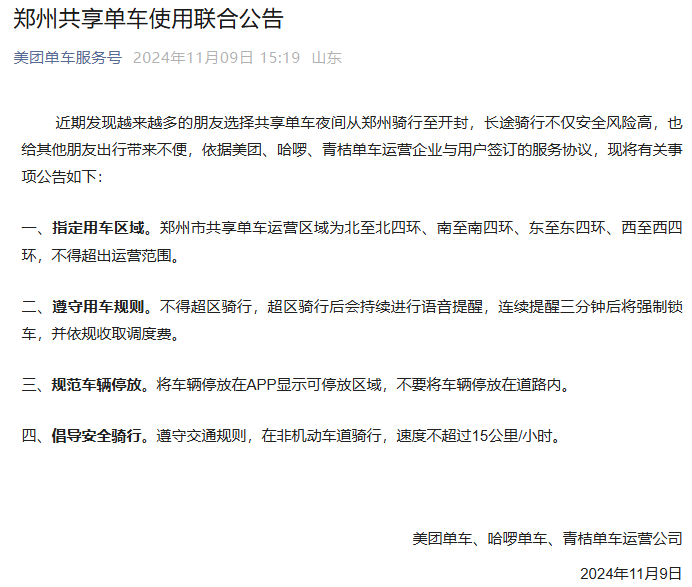 近期發現越來越多的朋友選擇共享單車夜間從鄭州騎行至開封,長途騎行不僅安全風險高,也給其他朋友出行帶來不便,依據美團、哈囉、青桔單車運營企業與用户簽訂的服務協議,現將有關事項公告如下:
