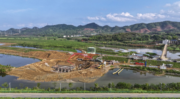 2024年4月12日,江西九江,瑞昌市賽湖大堤螺螄港電排站項目工地上,工人們正在加緊施工。 視覺中國