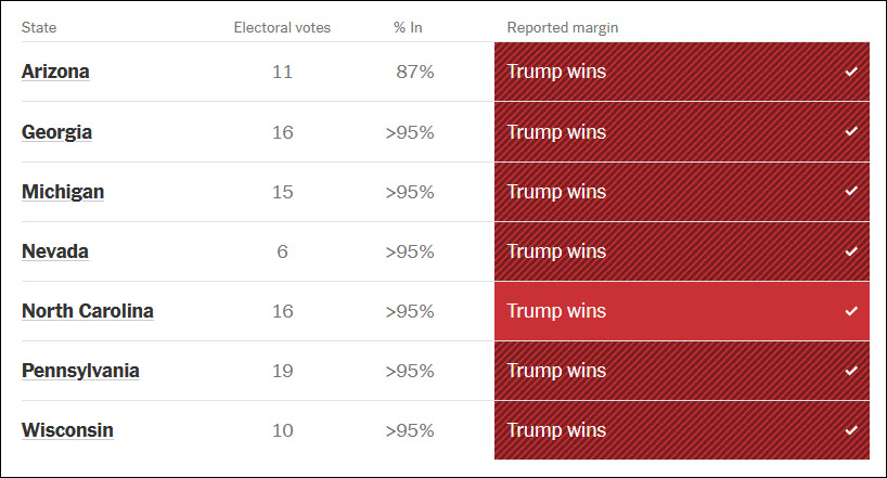 美媒測算,特朗普將在全部7個搖擺州獲勝 《紐約時報》報道截圖