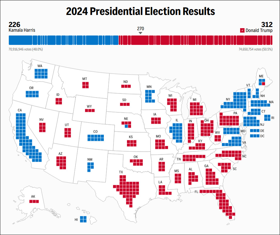 根據美聯社發佈的結果,特朗普將以312張選舉人票贏得2024年美國大選