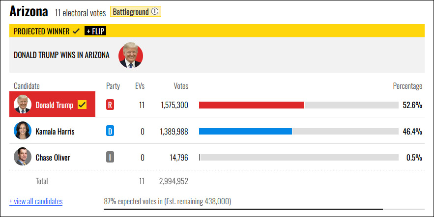 在亞利桑那州已完成統計的87%選票中,特朗普的得票率為52.6%,民主黨總統候選人哈里斯的得票率為46.4%。美聯社稱,對亞利桑那州投票歷史、縣一級政治人口統計數據和最新投票結果的分析顯示,哈里斯已經沒有反超的機會,因此測算特朗普獲勝。
