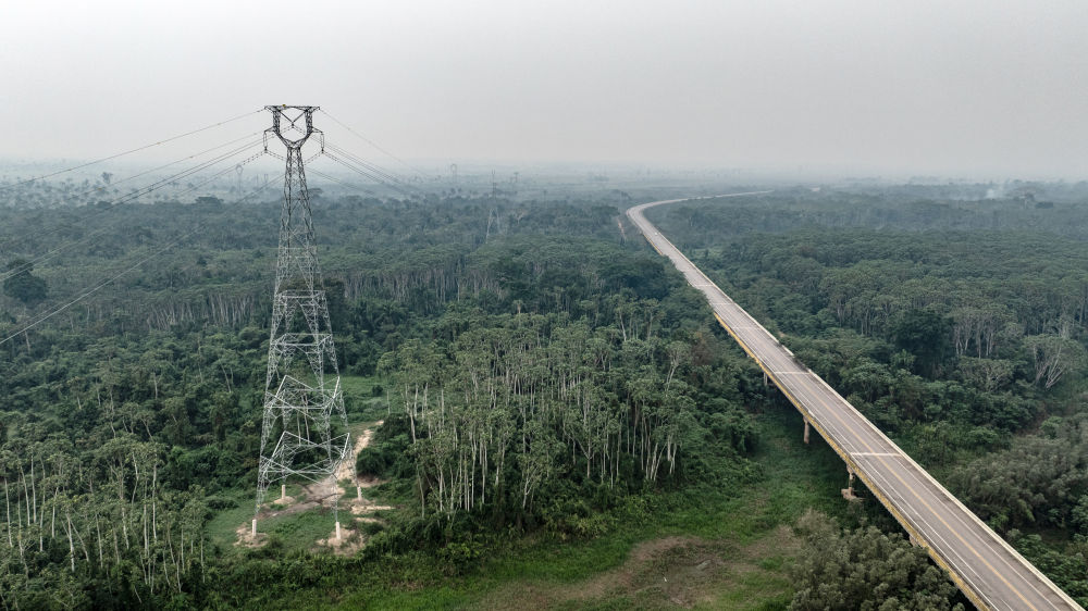 這張9月13日拍攝的照片顯示,在巴西朗多尼亞州,EDP輸變電項目線路穿越熱帶雨林(無人機照片)。巴西EDP輸變電項目是位於巴西北部的阿克里州和朗多尼亞州的綠地輸變電工程,山東電建一公司承擔了該項目的EPC總承包任務。新華社記者王天聰攝