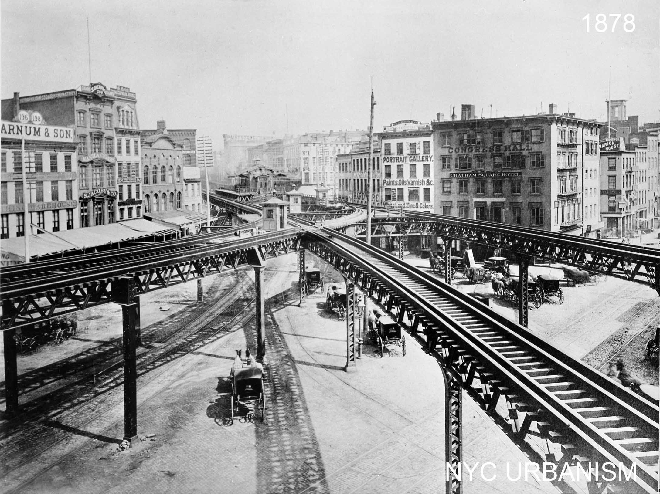 1878 年,從美國紐約曼哈頓下城查塔姆廣場的包釐街東側向北望去的第三大道線火車軌道。資料圖:NYC Urbanism
