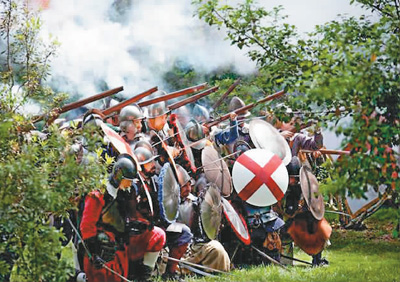 2007年5月11日,在美國弗吉尼亞州詹姆斯敦殖民定居點舊址,一些全副武裝的演員正在重現當年殖民者士兵與印第安人戰鬥的場景。 新華社