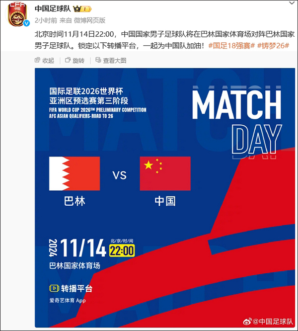 @中國足球隊 發佈了該場比賽的直播預告海報。海報顯示,轉播平台為愛奇藝體育App。中央廣播電視總枱不在其中。