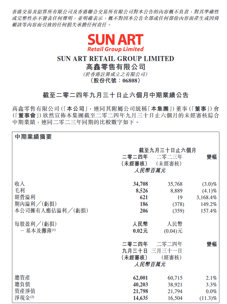 11月12日晚間,大潤發母公司高鑫零售發佈截至9月30日的2025財年中期業績報告:報道期內,高鑫零售營收347.08億元人民幣,税後溢利1.86億元,同比增加5.64億元,實現扭虧為盈。