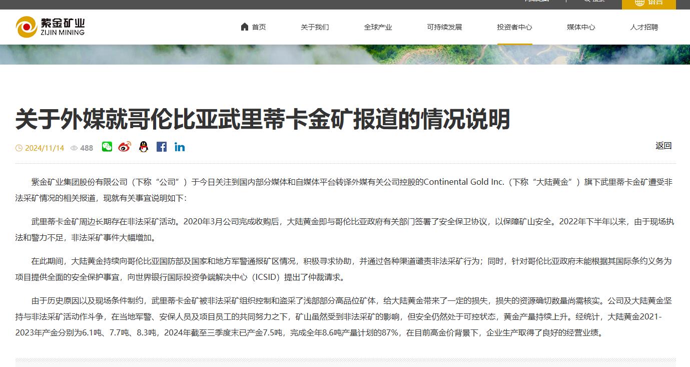 據紫金礦業官網14日消息,紫金礦業集團股份有限公司(下稱“公司”)於今日關注到國內部分媒體和自媒體平台轉譯外媒有關公司控股的Continental Gold Inc.(下稱“大陸黃金”)旗下武裏蒂卡金礦遭受非法採礦情況的相關報道,現就有關事宜説明如下: