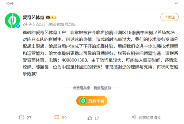 當天,@愛奇藝體育 發佈聲明致歉稱,“非常抱歉在今晚世預賽亞洲區18強賽中國男足首場客場對陣日本隊的直播中,因球迷的熱情,造成瞬時流量過大。我們的技術服務資源分配超出限額,給部分用户造成了不好的觀賽體驗。後續我們會進一步加強技術預案和運營能力,給大家提供更穩定可靠的直播服務。”