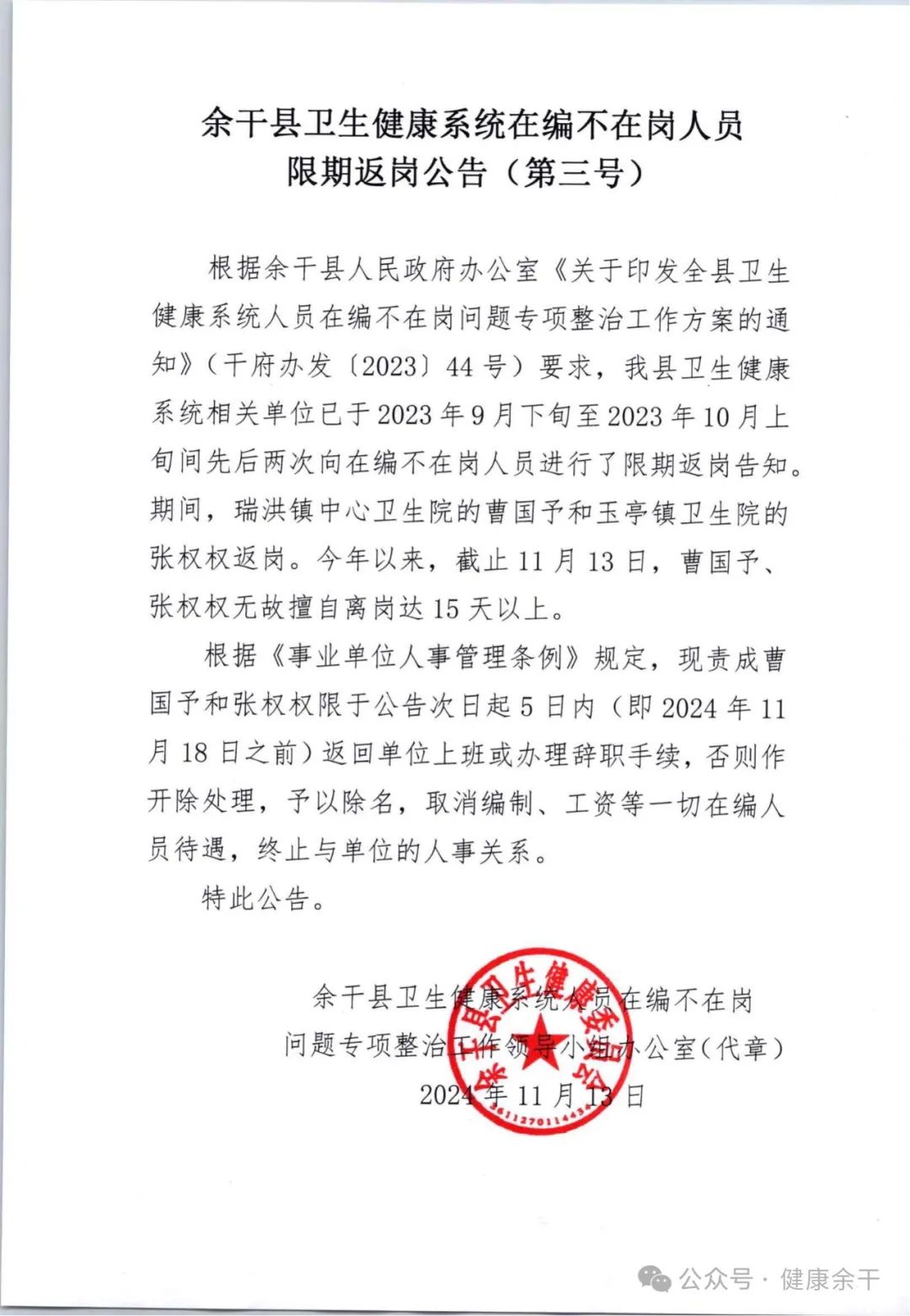 公告顯示,根據餘干縣政府辦公室《關於印發全縣衞生健康系統人員在編不在崗問題專項整治工作方案的通知》(幹府辦發[2023]44號)要求,該縣衞生健康系統相關單位已於2023年9月下旬至2023年10月上旬間先後兩次向在編不在崗人員進行了限期返崗告知。在此期間,瑞洪鎮中心衞生院的曹國予和玉亭鎮衞生院的張權權返崗。今年以來,截至11月13日,曹國予、張權權無故擅自離崗達15天以上。