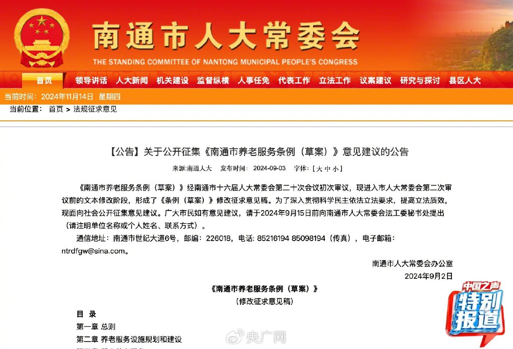 今年9月2日,南通市人大常委會辦公室對外發布關於公開徵集《南通市養老服務條例(草案)》意見建議的公告。公告提出,獨生子女父母年滿六十週歲後患病住院期間,獨生子女每年享受不少於5天的帶薪護理假。支持用人單位為非獨生子女及其他依法負有贍養、扶養義務的人員提供同等待遇。