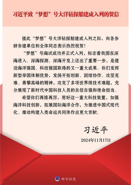 習近平在賀信中指出,“夢想”號海試成功並正式入列,標誌着我國在深海進入、深海探測、深海開發上邁出了重要一步,是建設海洋強國、科技強國取得的又一重大成果。你們發揮新型舉國體制優勢,發揚開拓創新、團結協作、攻堅克難、勇攀高峯的精神,攻克了多項世界級技術難題,充分展現了新時代中國科技人員的自信自強和使命擔當。