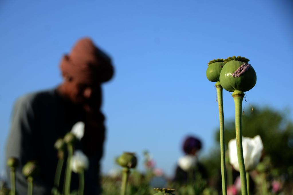 2022年4月3日,農民在阿富汗坎大哈一處罌粟田採摘罌粟。阿富汗臨時政府當天宣佈,該國境內禁止罌粟種植及其相關產品交易。 新華社