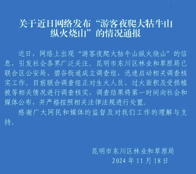 昆明市東川區林業和草原局微信公眾號“東川林業”11月18日發佈關於近日網絡發佈“遊客夜爬大牯牛山縱火燒山”的情況通報。
