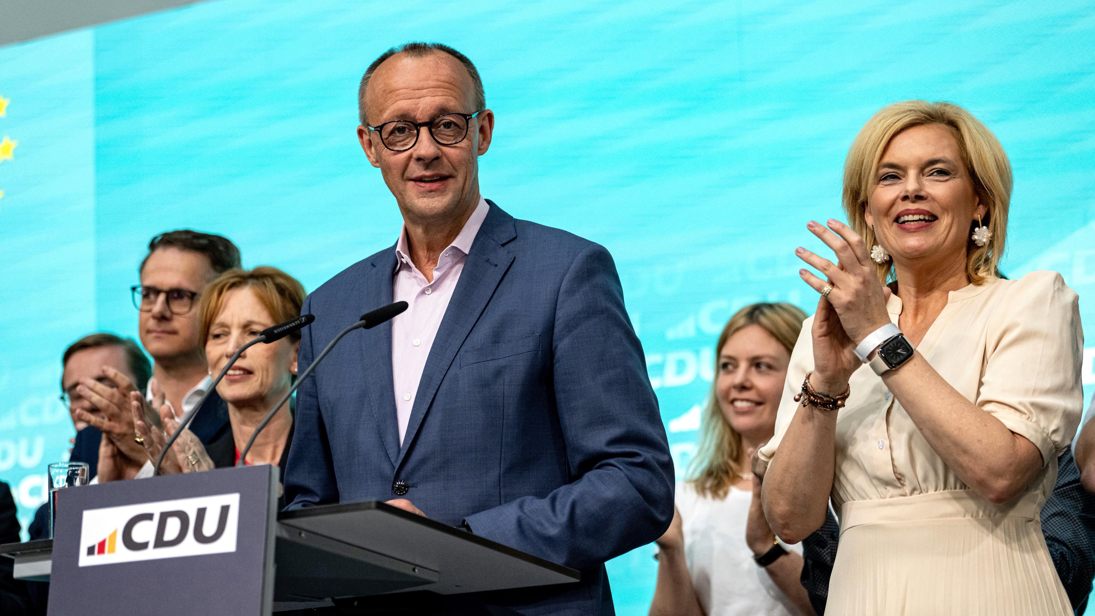 德國聯盟黨議會黨團領導人、基民盟黨首弗里德里希·默茨(中)有望成為下一任總理。 德新社