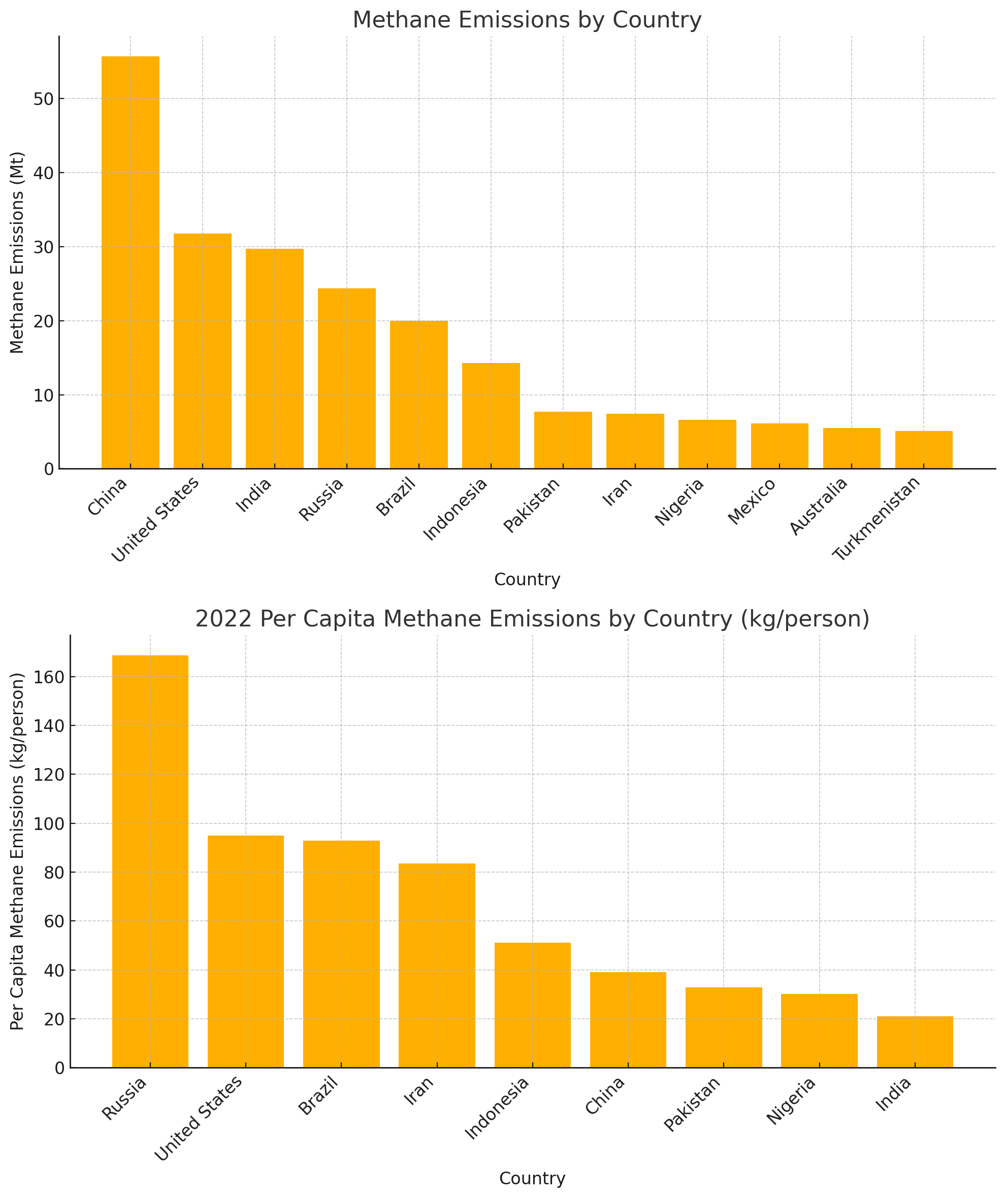 各國由人類活動產生的甲烷排放量以及人均甲烷排放量 IEA