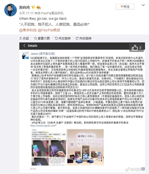 樊俊超指,“這是買了別人尚未量產的概念機”、“難怪得不到尊重和認可”,並表示不服就把產品拿出來賣,“不要像個縮頭烏龜而只會在國內炒概念以假亂真混淆視聽”。而劉自鴻甚至直接在微博上激動發文:“When they go low, we go hard. 人不犯我,我不犯人,人若犯我,雖遠必誅!”,使得這場罵戰升級,柔宇科技再次破圈。