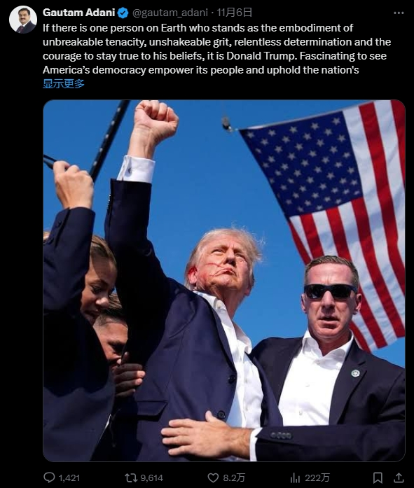 11月6日,阿達尼在社交媒體X平台發文祝賀特朗普勝選,並承諾向美國投資100億美元。他當時寫道:“如果説地球上有一個人是堅不可摧的毅力、不可動搖的勇氣、堅持不懈的決心,以及保持真實的勇氣的化身,那就是唐納德·特朗普。”