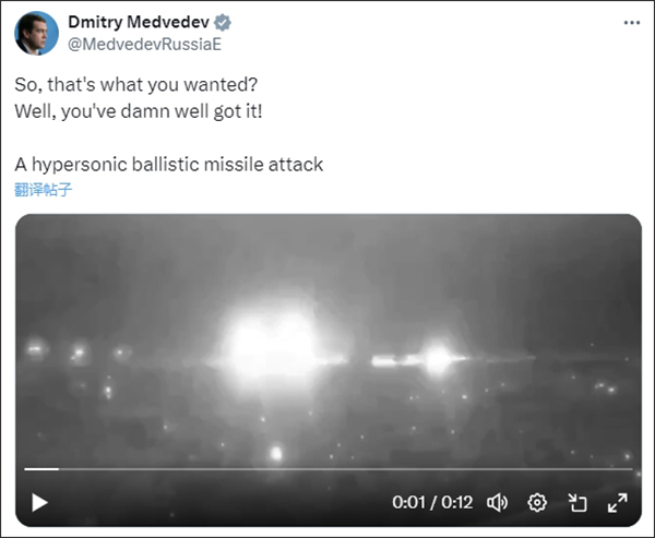 梅德韋傑夫用英文寫道:“那就是你們想要的?好吧,你們得到了!高超音速導彈攻擊。”